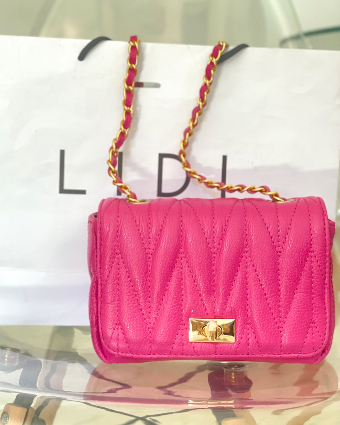 Bolsa em couro legítimo, com acabamento matelassê, cor pink, fecho metálico e alça em corrente com detalhe em couro.