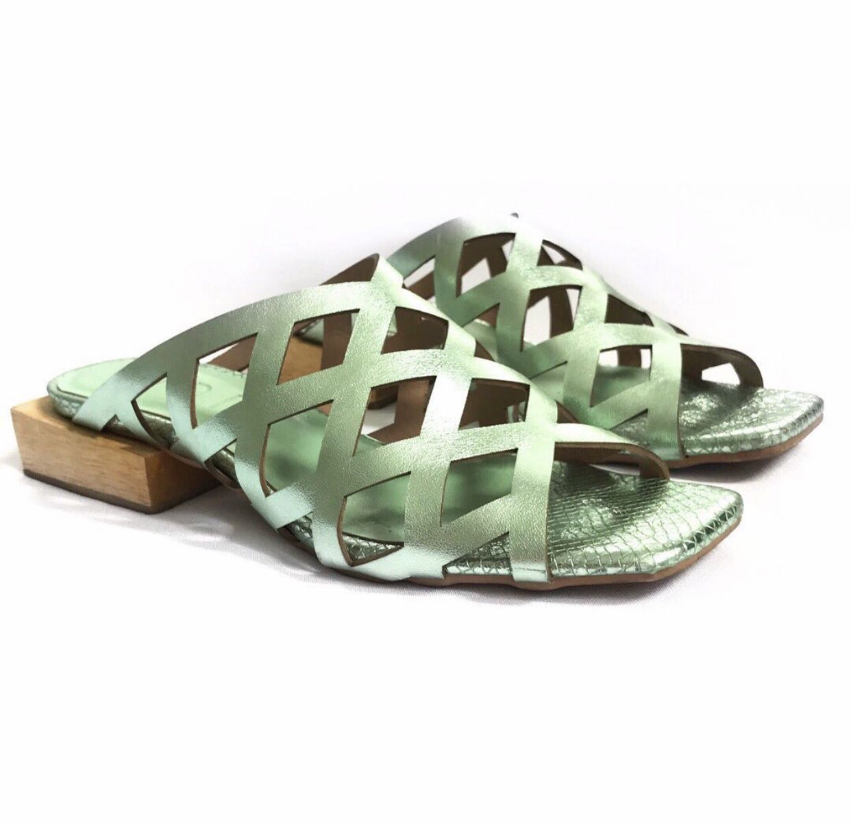Flat metalizada em couro fake verde com salto de madeira natural, altura 2cm.