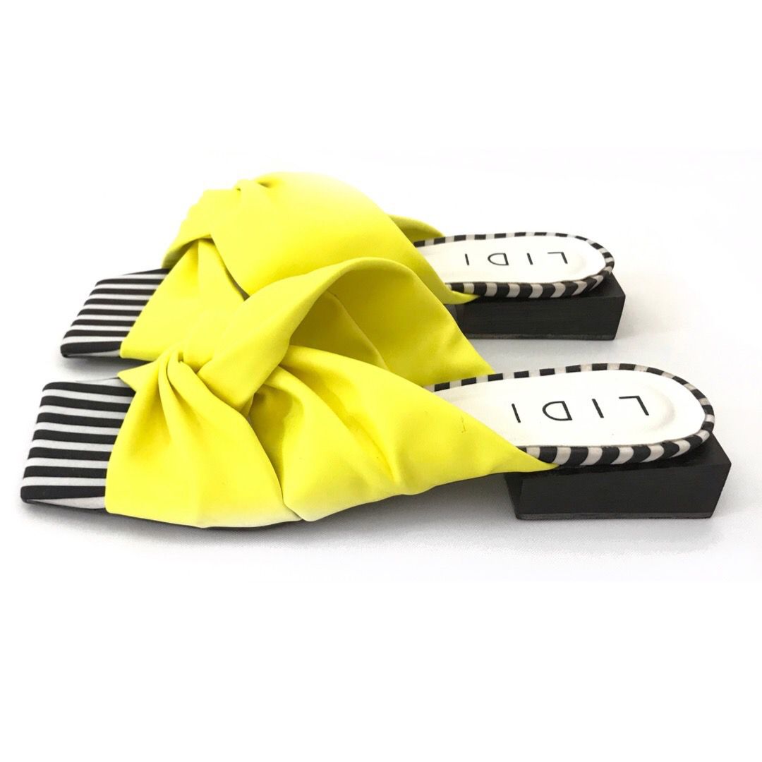 Flat em soft lima e palmilha em tecido listrado com salto de madeira natural preto.